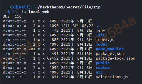 在解压的文件目录中可以看到 .env 文件,这个文件一般用于保存在服务器中的 node 全局环境变量函数,我们需要的 Secret Key 密钥一般也都保存在这里。但尝试使用 TOKEN_SECRET = 'Secret' 参数进行构建 JWT 后发现验证失败,怀疑正确的密钥保存在 git 历史记录里。使用 git log -p 进行查阅成功找到正确的密钥: