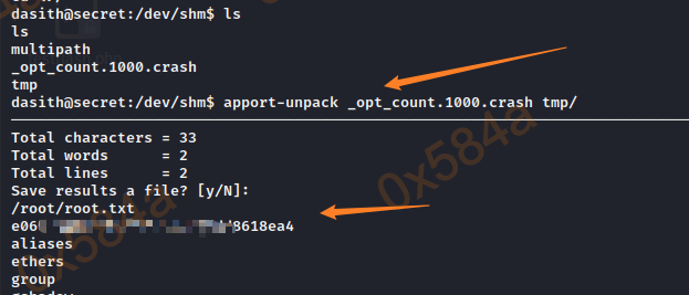 通过执行 strings tmp/CoreDump 命令成功得到 root flag。如果想获得 root 登录私钥,同理,只需要读取 /root/.ssh/id_rsa 文件即可。