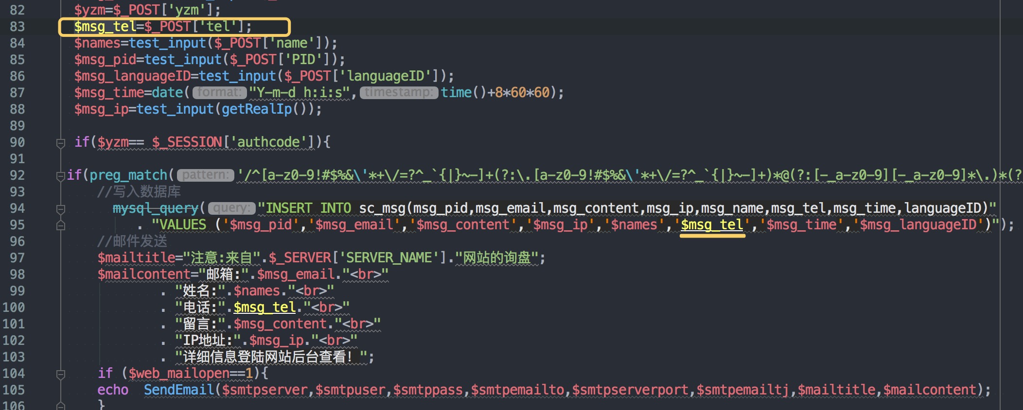 这段代码位于: Include/web_email.php 文件中,可以看到变量 $msg_tel 未过滤,然后拼接进了 insert into 的sql语句中。