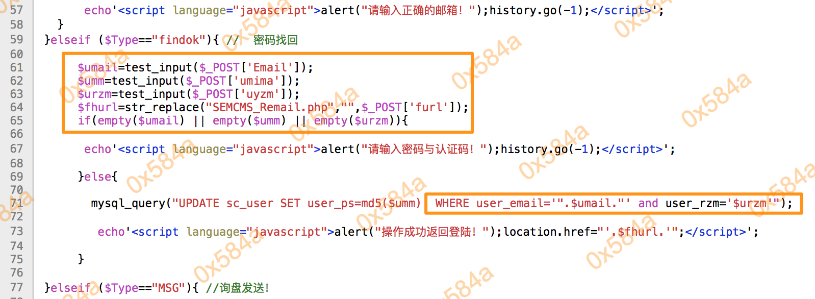 我们在看看重置密码的方法,在 $Type=="findok" 的时候: