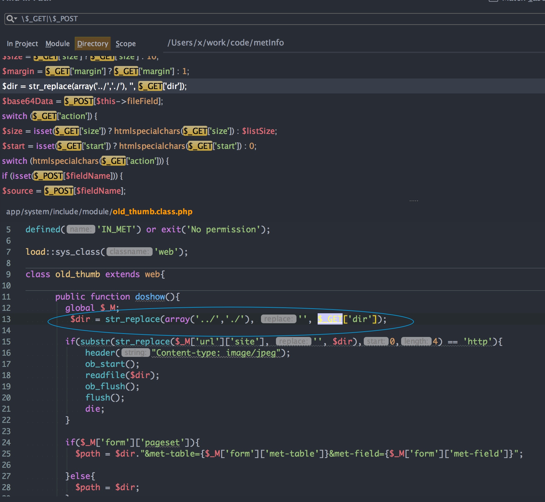 我们全局正则搜索下 \$_GET|\$_POST,发现一处可疑的地方接收 $_GET['dir'] 。