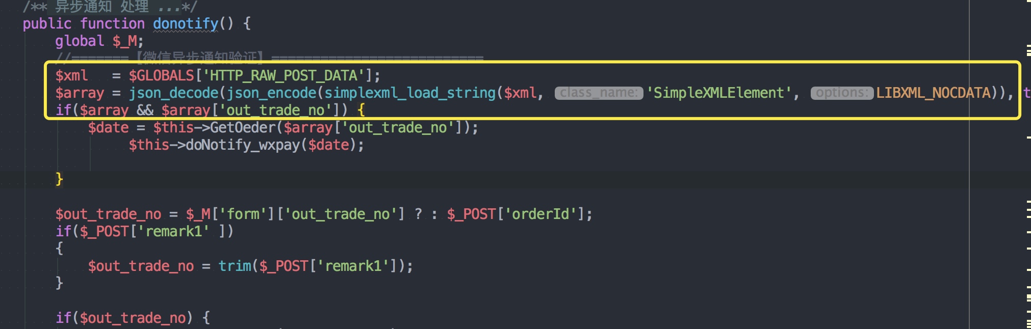 漏洞发生在此处文件:app/system/pay/web/pay.class.php,未禁外部实体加载: