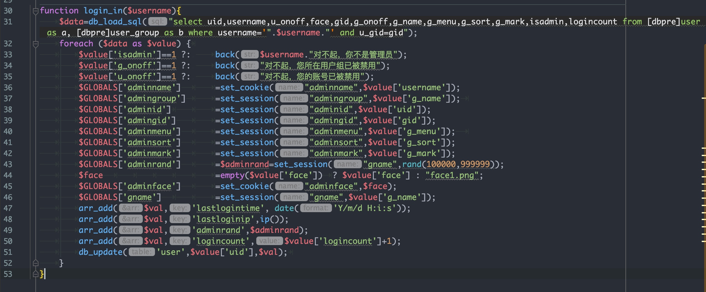 原因是,当然我们绕过第一段账号密码判断的SQl后,存在一个 login_in($adminname);