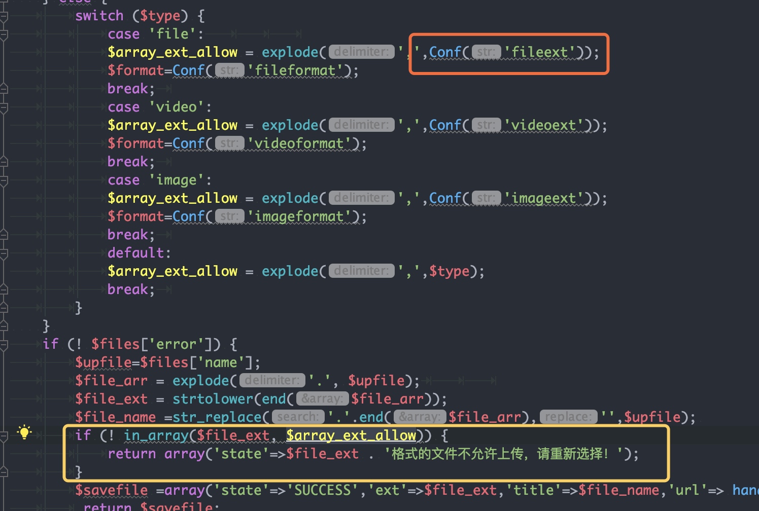 关键代码在 inc/zzz_file.php 中的 upload() 方法,会取出我们刚才加在附件类型中的php,进行文件名后缀的白名单比对。
