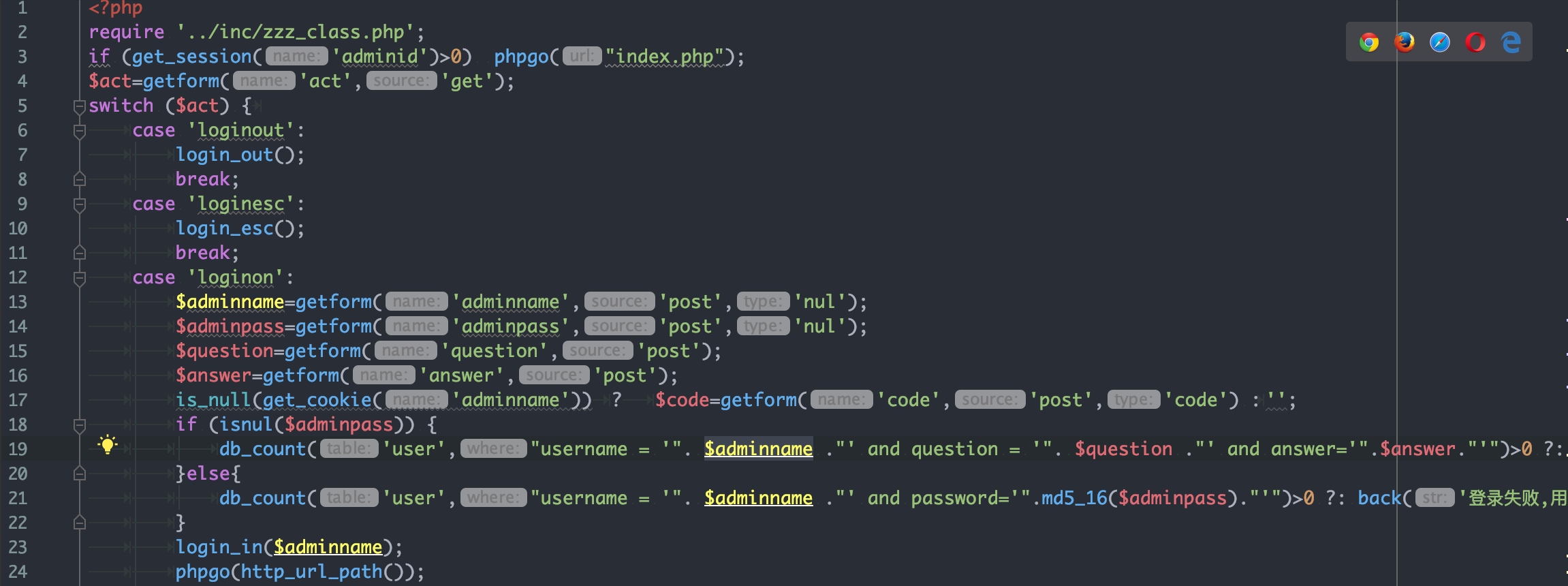 用户名是 $adminname,这里的 getform() 是去 POST 中找 adminname 这个参数,如果没找到则返回 null。