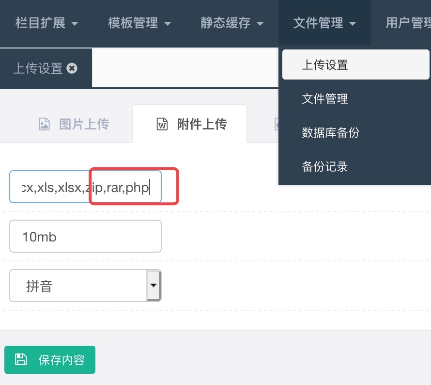 首先在 文件简历->上传设置->附件类型 中,加入一个php。