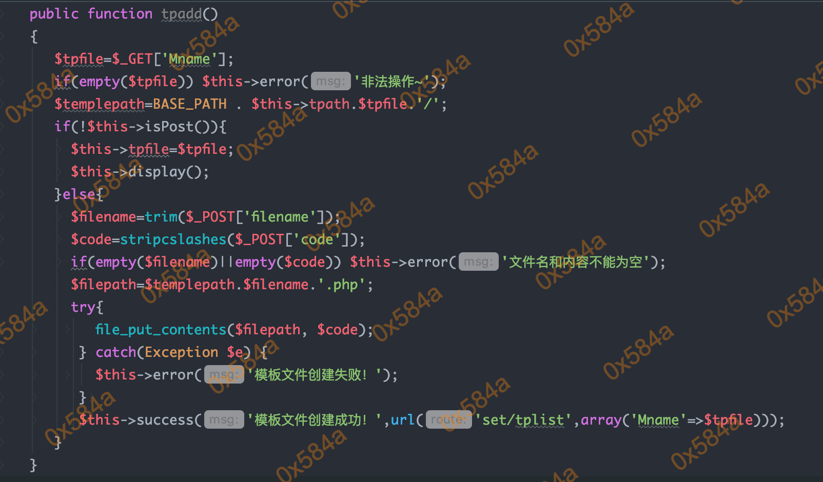 通过全局搜索 file_put_contents 函数,找到了在 \setController::tpadd 可以进行脚本文件的写入