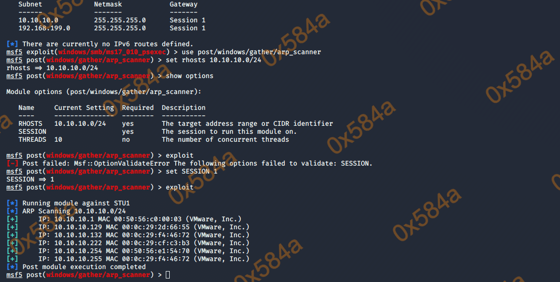 并在靶机一上反弹 MSF 上线,加入对应路由器段扫描存活主机