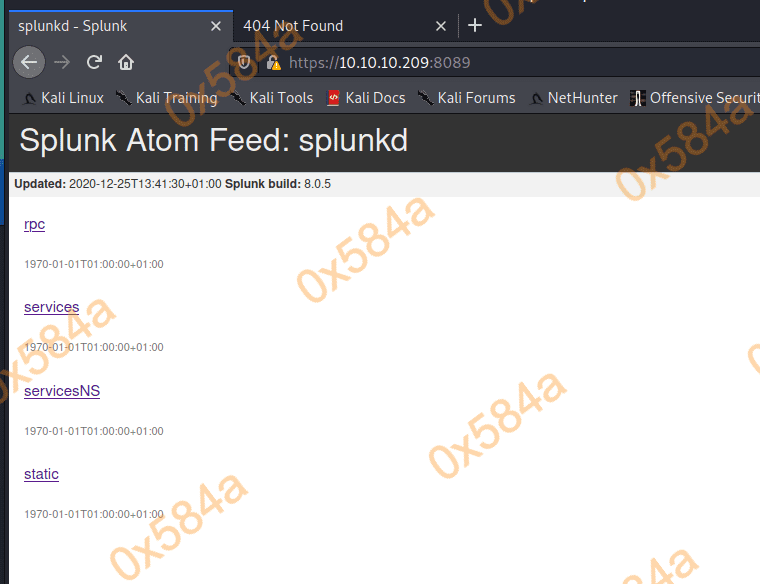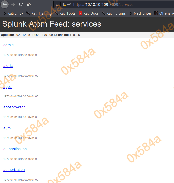 再看看 8089 ,运行的是 Splunk 8.0.5,点击目录连接都需要进行 Basic 权限验证。