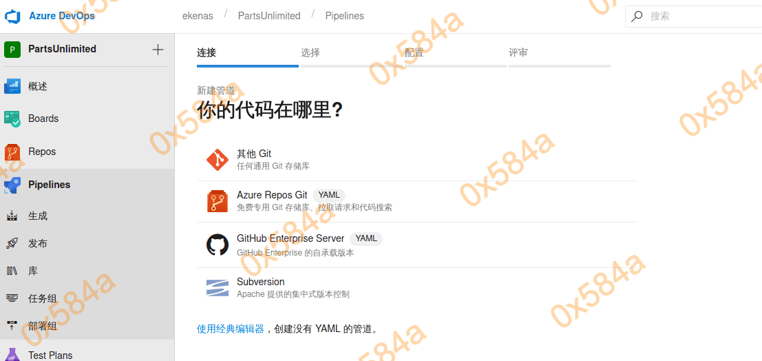 进入 Pipelines 新建管道,选择 Azure Repos Git