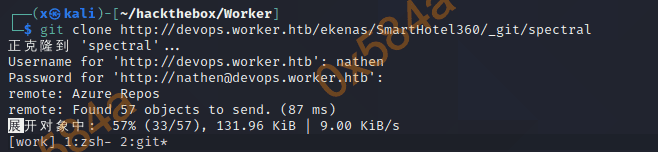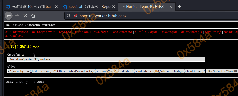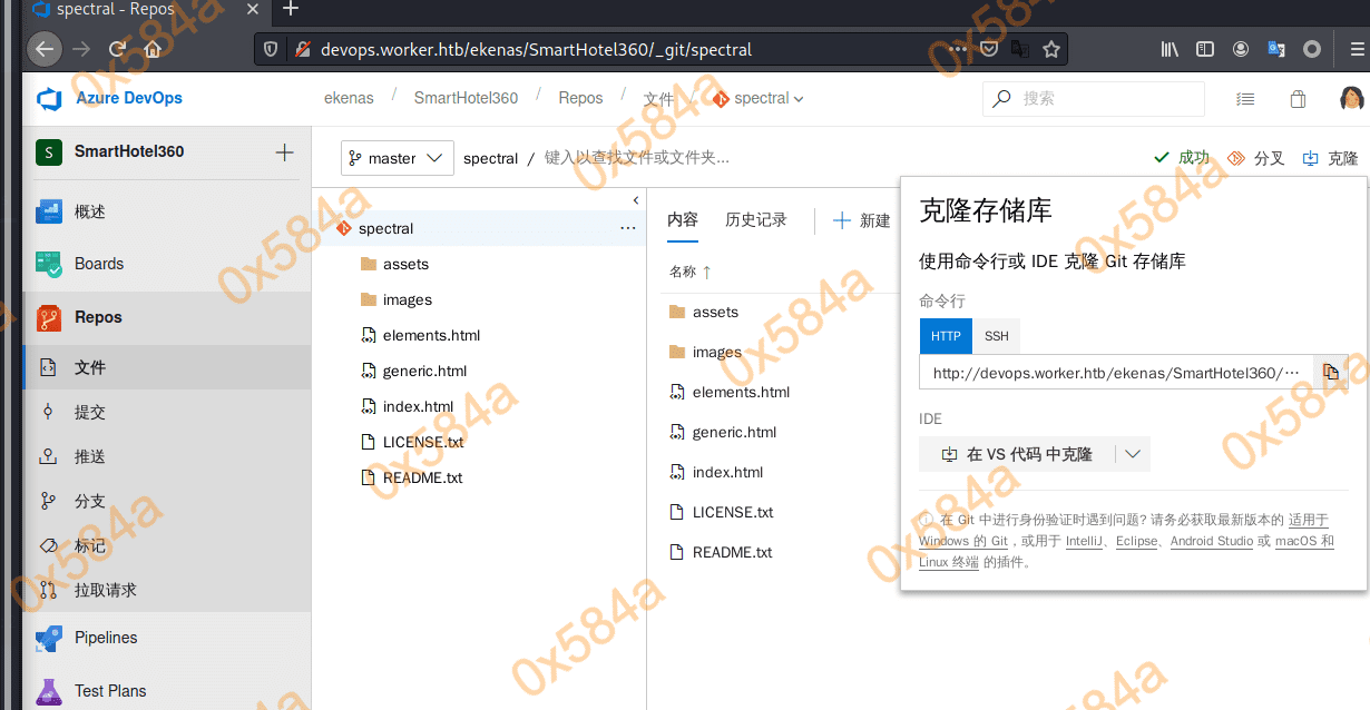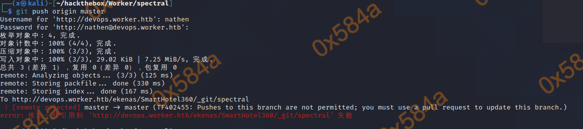 从分支仓库内的 index.html 文件 title 标签确认当前的代码是 spectral.worker.htb 的代码。尝试本地增加一个 webshell 后推送,提示权限不够。