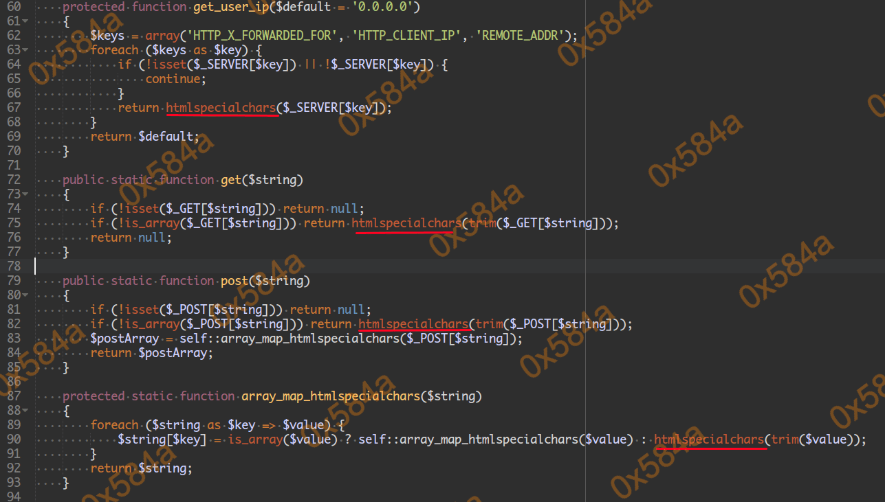 上述方法都用到了 htmlspecialchars()函数对传递变量做了转义,转义了双引号尖括号及 & 符。在看数据库查询用的是 参数化查询加PDO ,所以避免浪费时间,碰到模块中使用这些方法处理的接收变量直接放弃。