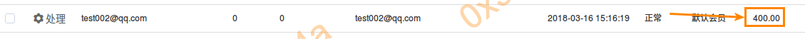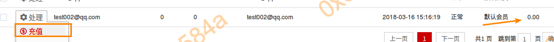 如图中所示,这个用户的金额是 0.00,我们先登录后台管理员账号,并给该账号充值 200。